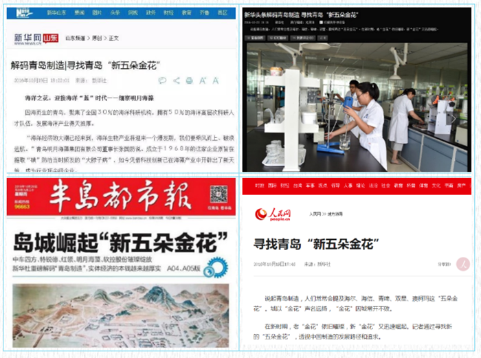 品牌成就城市,城市造就品牌。2016年8月,新華社“解碼青島”專題調(diào)研組抵青,圍繞“青島制造”的主題開展了集中調(diào)研,以“青島制造”為樣本,探尋中國制造之路。調(diào)研組先后到海爾、海信、青啤、雙星、澳柯瑪、明月海藻等22家知名企業(yè)進行實地調(diào)研采訪。新華社在調(diào)研之后,陸續(xù)推出了一系列“尋找青島‘新五朵金花’”的報道,其中,青島明月海藻集團因其鮮明的海洋品牌特色,被譽為青島“新五朵金花”之“海洋之花”。