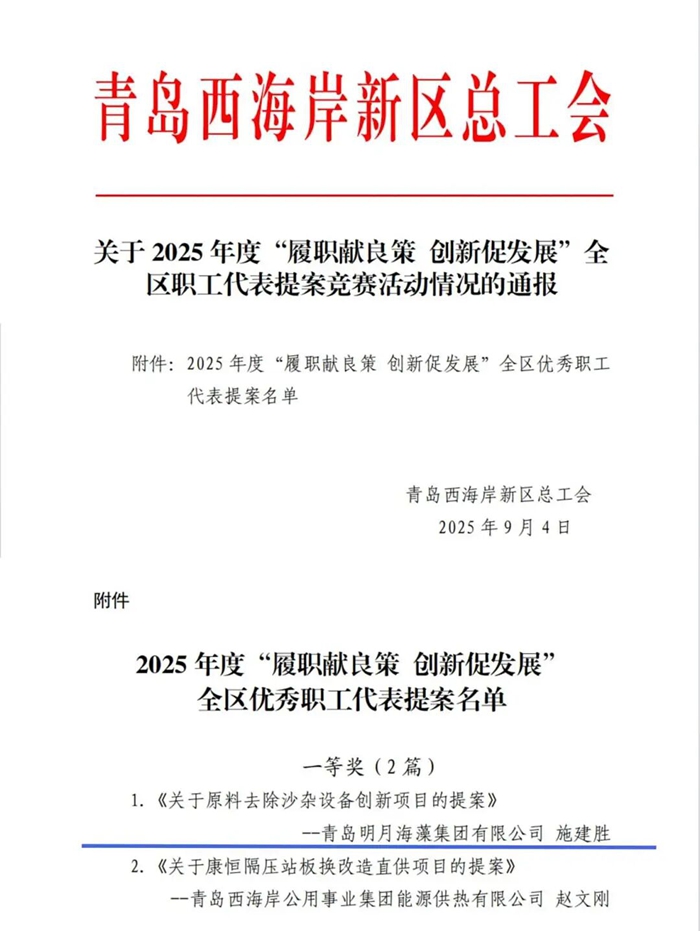 近日,在青島西海岸新區(qū)總工會(huì)主辦的“履職獻(xiàn)良策 創(chuàng)新促發(fā)展”職工代表提案競(jìng)賽中,明月海藻集團(tuán)提報(bào)的《關(guān)于原料去除沙雜設(shè)備創(chuàng)新項(xiàng)目的提案》從23件優(yōu)秀提案中脫穎而出,榮獲大賽最高獎(jiǎng)項(xiàng)一等獎(jiǎng)!